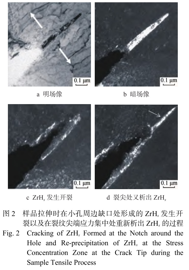 圖 2 記錄了已經(jīng)析出生長的 ZrH x 在拉伸過程中發(fā)生開裂后在裂紋尖端應(yīng)力集中區(qū)又析出ZrH x 的過程,圖中箭頭標(biāo)記出拉伸應(yīng)力的方向 [8] 。